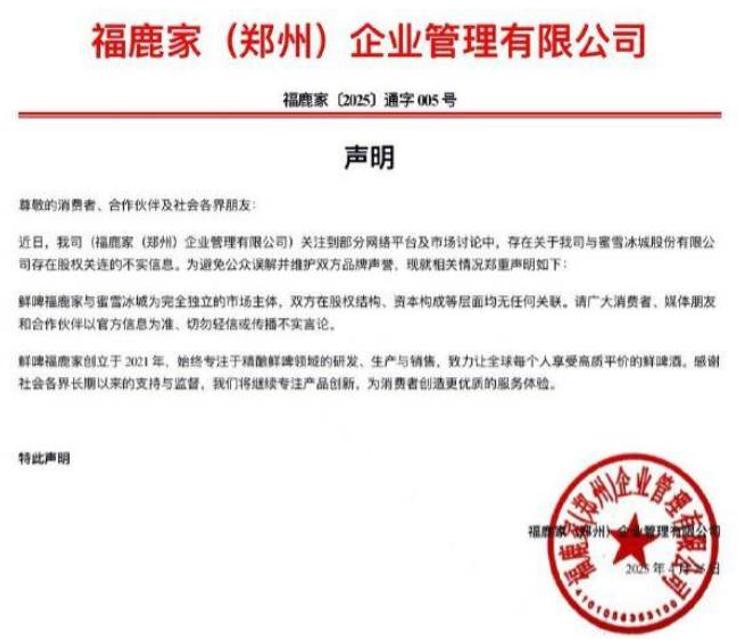 然而,盡管鮮啤福鹿家從創(chuàng)立之初就“暗戳戳”享受著蜜雪冰城的光環(huán),但是,雙方的官方回應(yīng)卻予以否認(rèn)。他們多次公開聲明:“雙方為完全獨(dú)立的市場主體,在股權(quán)結(jié)構(gòu)、資本構(gòu)成等方面均無任何聯(lián)系。”甚至在今年4月,鮮啤福鹿家還曾再次發(fā)表聲明否認(rèn)與蜜雪冰城的關(guān)聯(lián)。