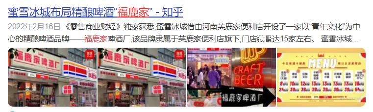 鮮啤福鹿家的前身是一家叫芙鹿家的便利店,在2022年正式更名為“福鹿家”,并將主要業(yè)務(wù)轉(zhuǎn)向精釀啤酒領(lǐng)域?!扒珊稀钡氖?,搜索芙鹿家時(shí),同樣看到了“芙鹿家和蜜雪冰城的關(guān)系”的詞條。