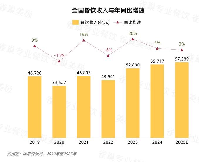 根據(jù)《白皮書》數(shù)據(jù),2025年1-10月,全國(guó)餐飲收入3.63萬億元,同比增長(zhǎng)2.3%;預(yù)計(jì)全年將從2024年的5.57萬億元增長(zhǎng)至約5.74萬億元,同比增幅維持在3%左右
