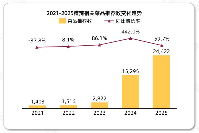以“鮮爽辣”為例,其代表當(dāng)屬貴州菜的靈魂——糟辣?!栋灼凤@示,與“糟辣”相關(guān)的菜品推薦數(shù),從2021年的1403飆升至2025年的24422,增長(zhǎng)超過16倍