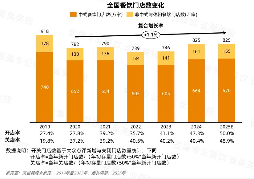 更值得關(guān)注的是競(jìng)爭(zhēng)基數(shù)的龐大——中國(guó)每萬人擁有87家餐飲門店,密度是美國(guó)的近4倍。極高的供給密度,使得存量市場(chǎng)的爭(zhēng)奪呈現(xiàn)出一種近乎殘酷的動(dòng)態(tài)平衡:一邊是巨大的市場(chǎng)空間吸引著新玩家不斷入場(chǎng),另一邊則是激烈的競(jìng)爭(zhēng)以更快的速度將競(jìng)爭(zhēng)力不足的門店擠出賽道。