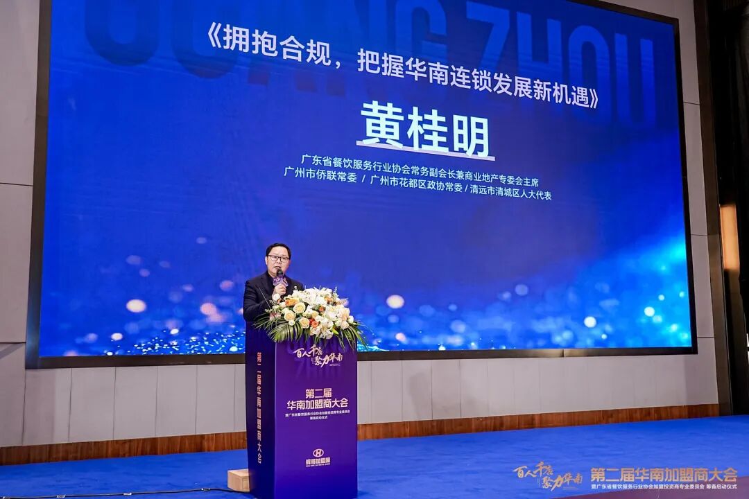 大會開篇,廣州市僑聯(lián)常委、廣州市花都區(qū)政協(xié)常委、清遠(yuǎn)市清城區(qū)人大代表 ,廣東省餐飲服務(wù)行業(yè)協(xié)會常務(wù)副會長兼商業(yè)地產(chǎn)專委會主席 黃桂明先生以《擁抱合規(guī),把握華南連鎖發(fā)展新機(jī)遇》為主題分享。
