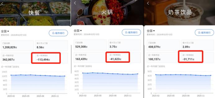 數(shù)據(jù)更是不會撒謊。根據(jù)窄門餐眼的數(shù)據(jù),2025年,那些曾經(jīng)風(fēng)光無限的擴張之王,紛紛踩下急剎車:快餐門店近一年凈減少113,494家,奶茶店少了31,711家,火鍋店少了41,623家。就連川菜、湘菜、粵菜這些經(jīng)典大品類,門店總數(shù)也齊齊掉頭向下。