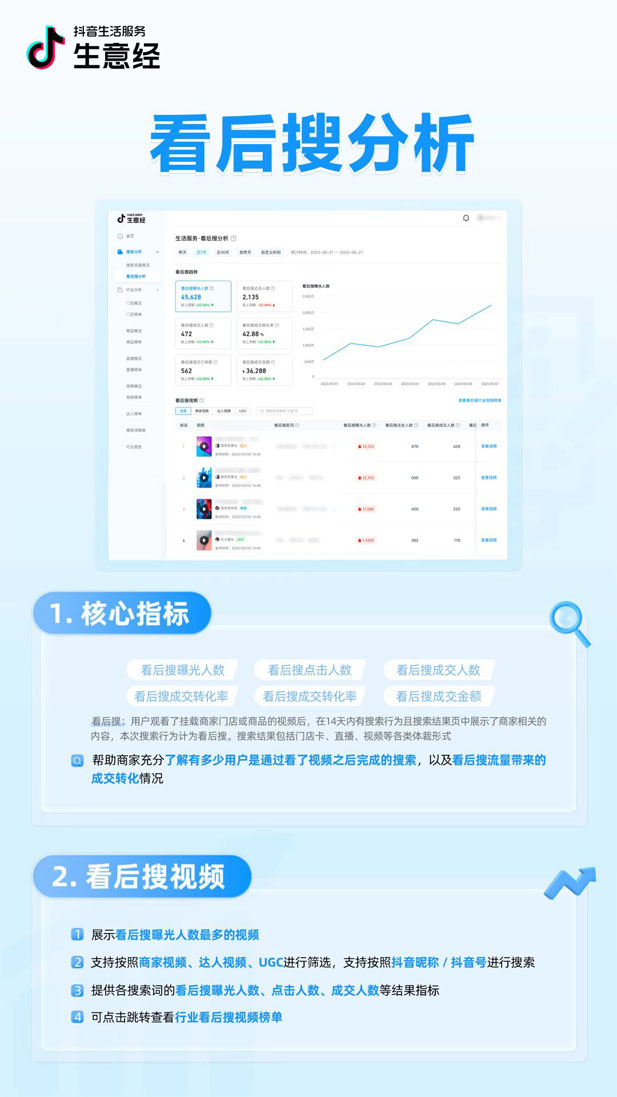 因此, 對于生活服務(wù)商家而言,搜索正在成為經(jīng)營必選項(xiàng) 。那如何提升搜索流量與搜索轉(zhuǎn)化?又如何長效經(jīng)營品牌自己的搜索場? 抖音生活服務(wù)官方數(shù)據(jù)平臺——生意經(jīng)上線「搜索數(shù)據(jù)」能力 ,本期包含 「搜索流量概覽」 、 「搜索詞榜單」  「看后搜分析」  「視頻看后搜索榜」 4大功能,助力商家提升搜索流量曝光和轉(zhuǎn)化,從而提升經(jīng)營結(jié)果。