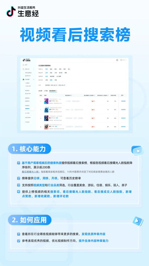 · 【搜索詞榜單】和【視頻看后搜索榜】:所有注冊用戶均可查看,通過抖音來客的【行業(yè)數(shù)據(jù)】菜單或生意經(jīng)網(wǎng)址訪問 https://www.life-data.cn/query/rank