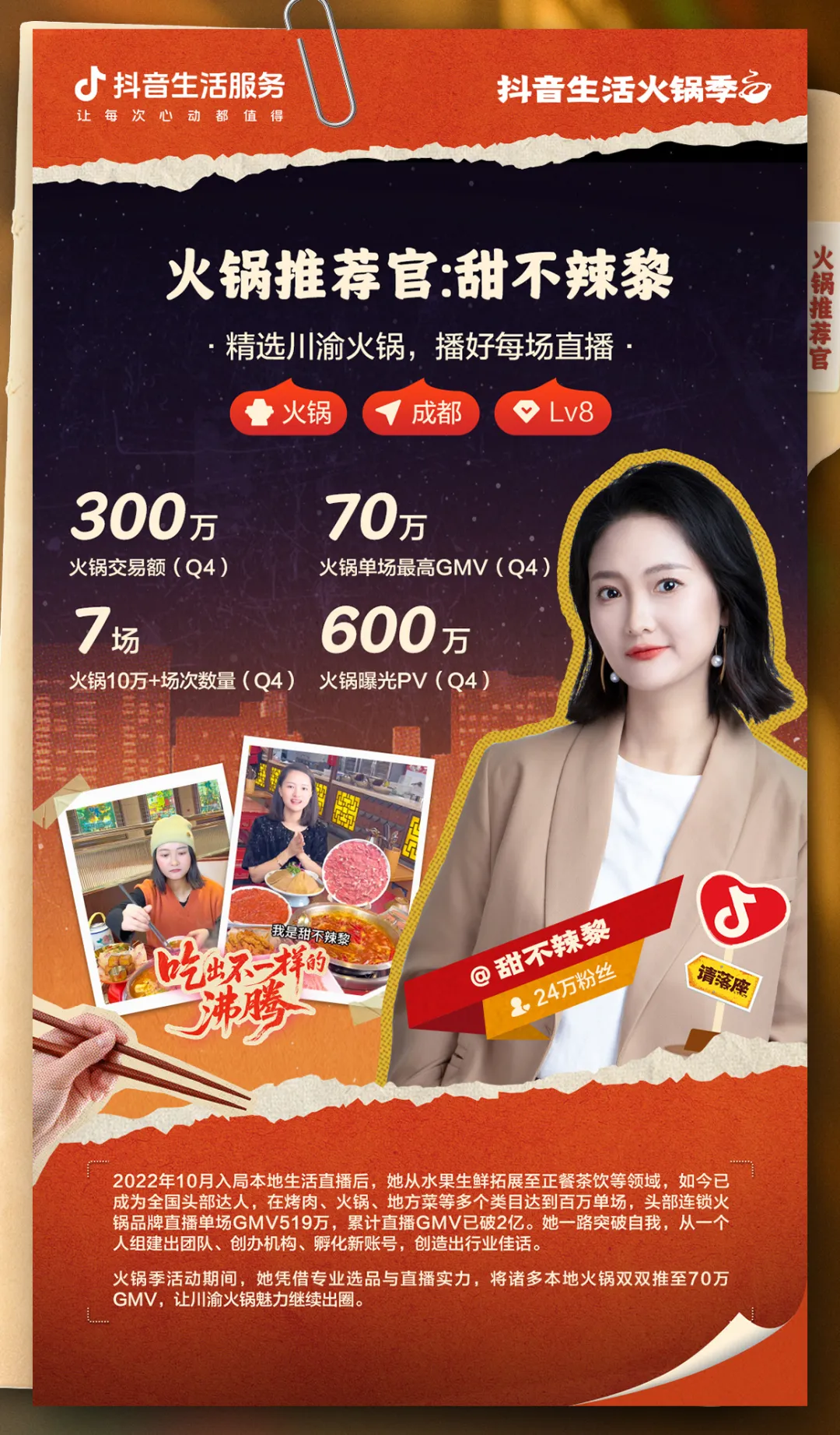 成都達(dá)人“甜不辣黎”從水果生鮮賽道起步,隨后涉足正餐、茶飲等多個領(lǐng)域,一路成長為全國頭部本地生活達(dá)人,如今不僅組建了專屬團(tuán)隊、創(chuàng)辦機構(gòu)孵化新賬號,更在火鍋賽道創(chuàng)下耀眼戰(zhàn)績:頭部連鎖火鍋品牌專場直播單場GMV曾高達(dá)519萬,多家重慶本地火鍋品牌直播均斬獲百萬成績。憑借成熟的直播運營經(jīng)驗與精準(zhǔn)的選品眼光,她為連鎖火鍋品牌破圈與細(xì)分火鍋品類推廣提供了高效范本,直播累計GMV已超2億,用專業(yè)交付力贏得商家與粉絲雙重認(rèn)可。