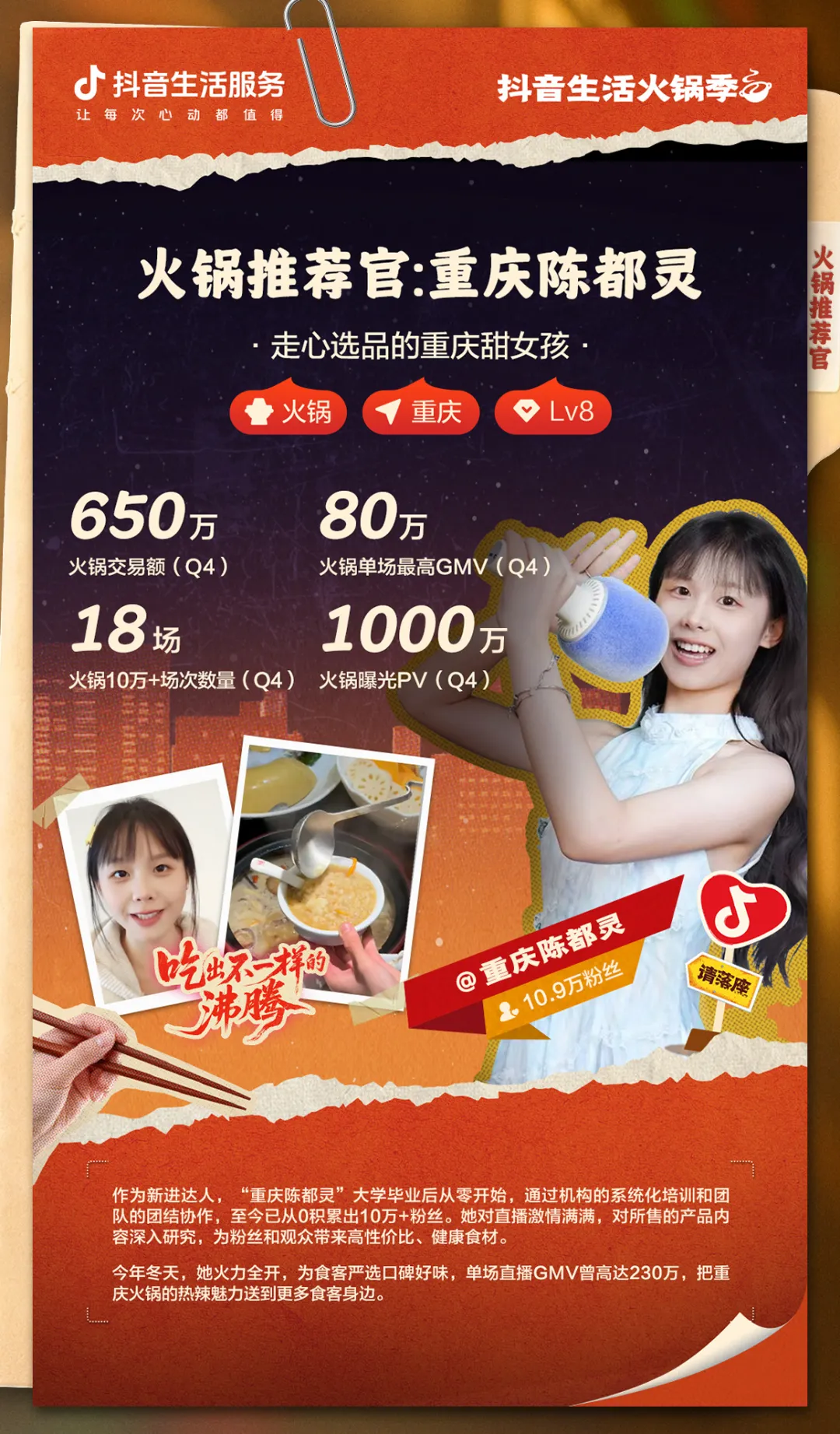 重慶達(dá)人“重慶陳都靈”作為行業(yè)新銳,也在本次活動中綻放出了強勁勢能。她在大學(xué)畢業(yè)后加入機構(gòu),經(jīng)系統(tǒng)化培訓(xùn)打磨,依托團(tuán)隊協(xié)作快速成長,在今年已積累出10萬+粉絲,躋身Lv8達(dá)人行列。她始終保持高激情直播狀態(tài),語言生動有感染力,直播前會深入研究產(chǎn)品,全程參與選品環(huán)節(jié),堅守“為粉絲帶來高性價比健康食材”的理念。在做火鍋品類直播時,她精準(zhǔn)洞察消費者對特色火鍋的多元需求,在今年冬季,火鍋交易額更是高達(dá)650萬,火鍋10萬+場次數(shù)量達(dá)18場,成為新銳達(dá)人快速成長的標(biāo)桿。