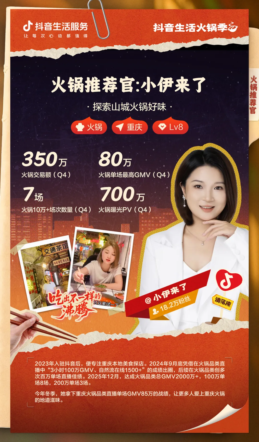 同為重慶本地達(dá)人的“小伊來了”,深耕本土火鍋賽道,盡顯地域優(yōu)勢。2023年入駐抖音后便專注重慶本地美食探店,2024年9月憑借在火鍋直播中的“3小時100萬GMV、自然流在線1500+”戰(zhàn)績成功出圈,此后持續(xù)發(fā)力火鍋品類,2025年12月單月火鍋總GMV突破2000萬,其中含8場百萬單場、3場200萬單場。在本次火鍋季活動中,她依舊表現(xiàn)亮眼,合作一眾重慶本地知名火鍋商戶均取得優(yōu)異戰(zhàn)績。憑借對本地火鍋市場的深度洞察,她助力區(qū)域火鍋熱度增長,成為重慶火鍋消費熱潮的有力推動者。