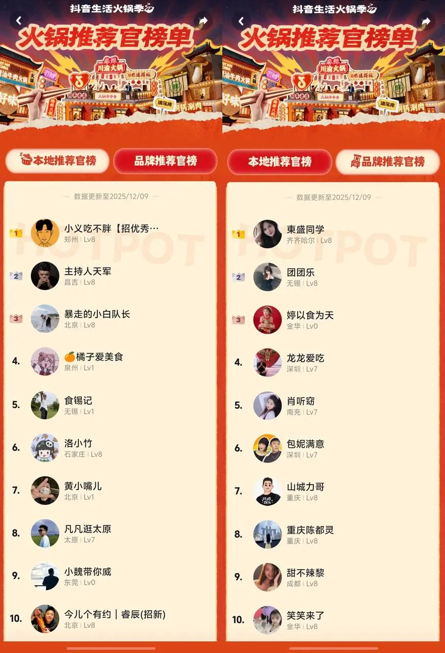 作為本次「抖音生活火鍋季」的重要達(dá)人玩法,火鍋推薦官榜單競爭熱度仍在攀升。無論是深耕本地的區(qū)域達(dá)人,還是輻射全國的品牌推手,都在通過優(yōu)質(zhì)內(nèi)容爭奪榜單席位,向豐厚獎勵發(fā)起沖擊:「本地推薦官榜」聚焦區(qū)域特色,鄭州“小義吃不胖”、太原“凡凡逛太原”等達(dá)人深耕本地探店,用接地氣的體驗分享挖掘城市火鍋寶藏;「品牌推薦官榜」則覆蓋全國連鎖品牌,成都“甜不辣黎”、重慶“重慶陳都靈”等達(dá)人憑借專業(yè)帶貨能力,助力品牌打破地域壁壘。