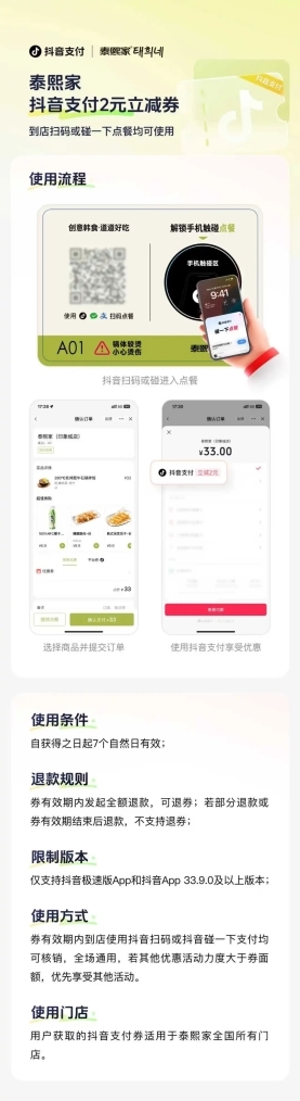 打通抖音小程序,意味著餐飲品牌得以直接進入抖音本地生活服務生態(tài),借助平臺7億日活用戶基礎,實現從內容種草到店消費的完整轉化閉環(huán)——用戶在平臺刷到視頻或搜索后,可直接購買團購券,到店掃碼后無縫進入點餐及核銷流程。