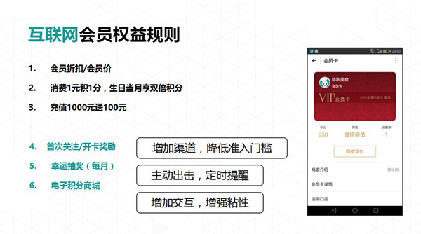 接下是設(shè)計(jì)一套會(huì)員權(quán)益,設(shè)計(jì)會(huì)員權(quán)益的目的是將會(huì)員的弱關(guān)系變成強(qiáng)關(guān)系,提升活躍度,所以每一步設(shè)置都應(yīng)該一步步地引導(dǎo)會(huì)員。另外,我們的會(huì)員是通過(guò)微信會(huì)員卡對(duì)接的,等于說(shuō)消費(fèi)者辦的是微信卡包的會(huì)員,同樣有積分、優(yōu)惠,是可以進(jìn)行合銷(xiāo)兌換的。這樣一來(lái),不僅提升了互聯(lián)網(wǎng)營(yíng)銷(xiāo)的功能,還降低了辦會(huì)員卡的門(mén)檻。