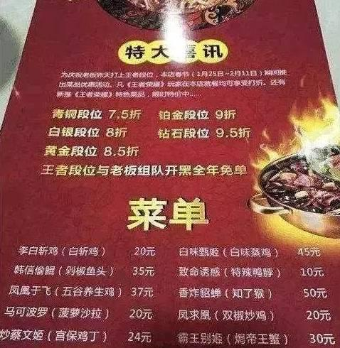 自從王者榮耀成為國民游戲以后,一些(癡迷游戲的)餐飲店老板也多了一個打折方案:段位越高,折扣越大!