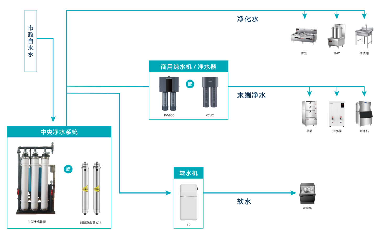 中端保障(烹飪/清洗區(qū)):為炒爐、湯鍋、洗碗機(jī)、洗菜池等區(qū)域供應(yīng) “凈化水”或“軟化水” 。重點(diǎn)解決水垢問(wèn)題,保護(hù)昂貴的熱力設(shè)備,提升清潔效率,同時(shí)滿足大量清洗用水需求。